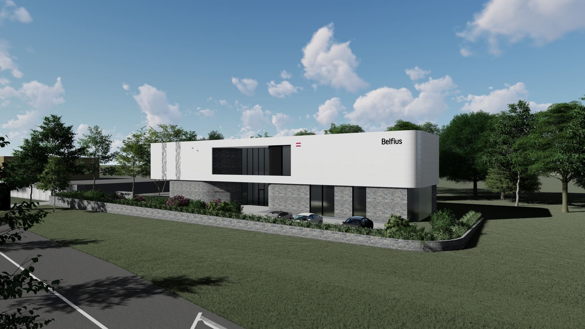 Le projet concerne la construction d’une agence bancaire Belfius à Marche-en-Famenne, développant une surface d’environ 880 m² sur un rez-de-chaussée et un étage en toiture plate. L’architecture contemporaine repose sur une composition de volumes horizontaux et de porte-à-faux marqués à l’étage. Le rez-de-chaussée est traité en revêtement de moellons, tandis que l’étage est habillé de panneaux métalliques blancs, soulignant clairement la hiérarchisation des niveaux et la lecture architecturale du bâtiment. Les espaces intérieurs accueillent les fonctions ouvertes au public, les zones de conseil, les bureaux et les locaux techniques, organisés de manière rationnelle et fonctionnelle.